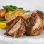 Tightly roll your turkey into a thick log shape, wrapping the bacon around it. There should be a clear seam where each slice meets its other end.