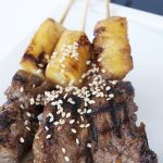 This is a sweet grilled beef and teriyaki skewer, where the teriyaki is sugar free, but the pineapple's natural fruit sugars can get a NICE rich charring for that deep glazy caramelized flavor.