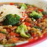 Add the mushrooms, zucchini, sausage, broccoli, string beans, white beans and elbow pasta to the soup pot. Allow to simmer for 6 minutes (do not overcook the pasta, or else the fiber matrix starts to break down and you may absorb more carbs ... 6 minutes will undercook the pasta by 2 minutes, but will allow a few more minutes for the pasta to be in the soup, while serving and garnishing).