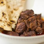 Add a little oil to the pan, and evenly distribute a handful of beef cubes. You want to sear the beef, to add a nice color, as well as lightly toasting the cumin. If you add too much beef, it will crowd the pan and your beef will not sear. When the beef has begun to color, toss the beef around in the pan, until all pieces of beef are very nicely caramelized and seared. Add the beef to the slower cooker. If you have more beef remaining, repeat this step until all the beef cubes are nicely caramelized and in the slow cooker.