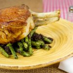 Finally, this pork chop has been split between the bones and packed with raw Italian sausage (sweet or spicy). Pork chops don't have a lot of fat, which tends to make them a fairly dry piece of meat. Sausage, on the other hand, is FULL of fat. If you stuff a dry piece of meat with fat, some of that fat is going to melt into the chop and add moisture, as well as additional flavors from the spices in the sausage!