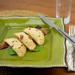 Evenly divide the filling between the sheets of dough, placing about 3 tbsp worth in the center of each sheet. Fold the sheets in half, crimping the two opposing halves together with your fingers, or the tines of a fork. Repeat this process until they are all formed.